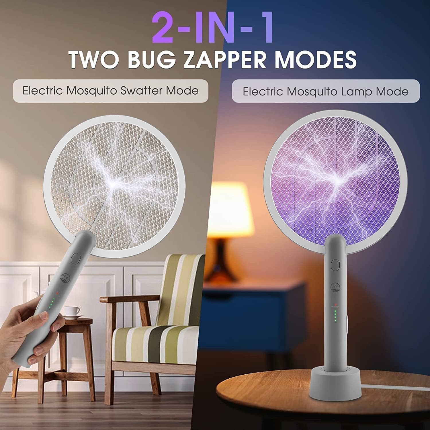 【2 in 1 Multifunction Bug Zapper】- Our Bug Zapper has upgraded 2 in 1 functions. You can turn on the "ON1" button to open the electric mosquito swatter mode to kill all flying types of bugs. In addition, you can also turn on the "ON2" button to open the mosquito lamp mode which will turn on the purple light to attract and shock mosquitoes.