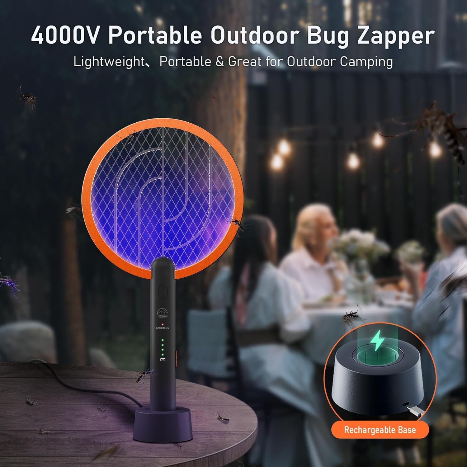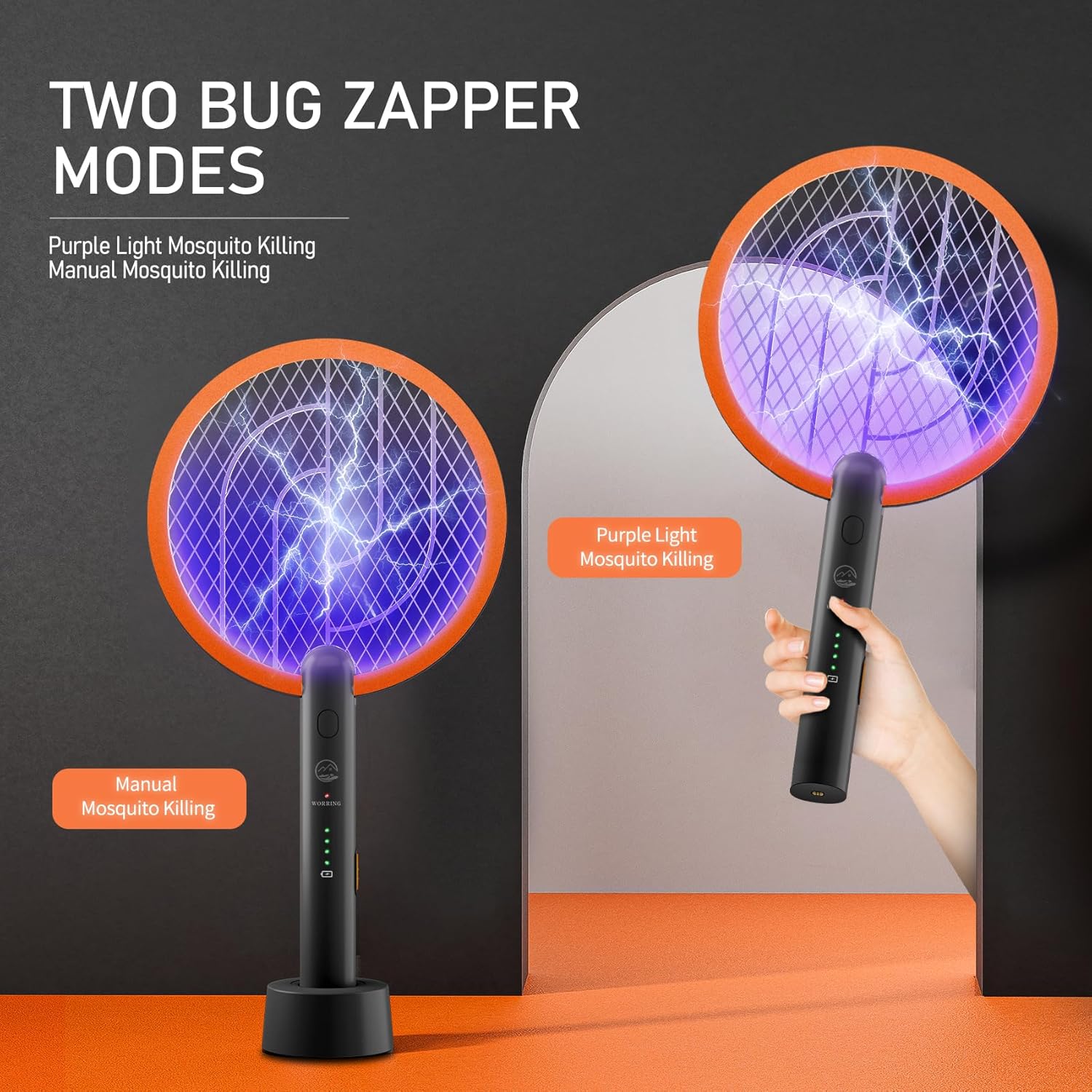 2-in-1 Multifunction Bug Zapper - Adopted new 2-in-1 Mosquito Swatter design, you can use this Bug Zapper as a Mosquito Racket to kill all flying types of bugs, mosquitos, and flies. Besides, you also put it in the rechargeable base as Insect Killing Lamp. Enjoying a comfortable & peaceful happy hour