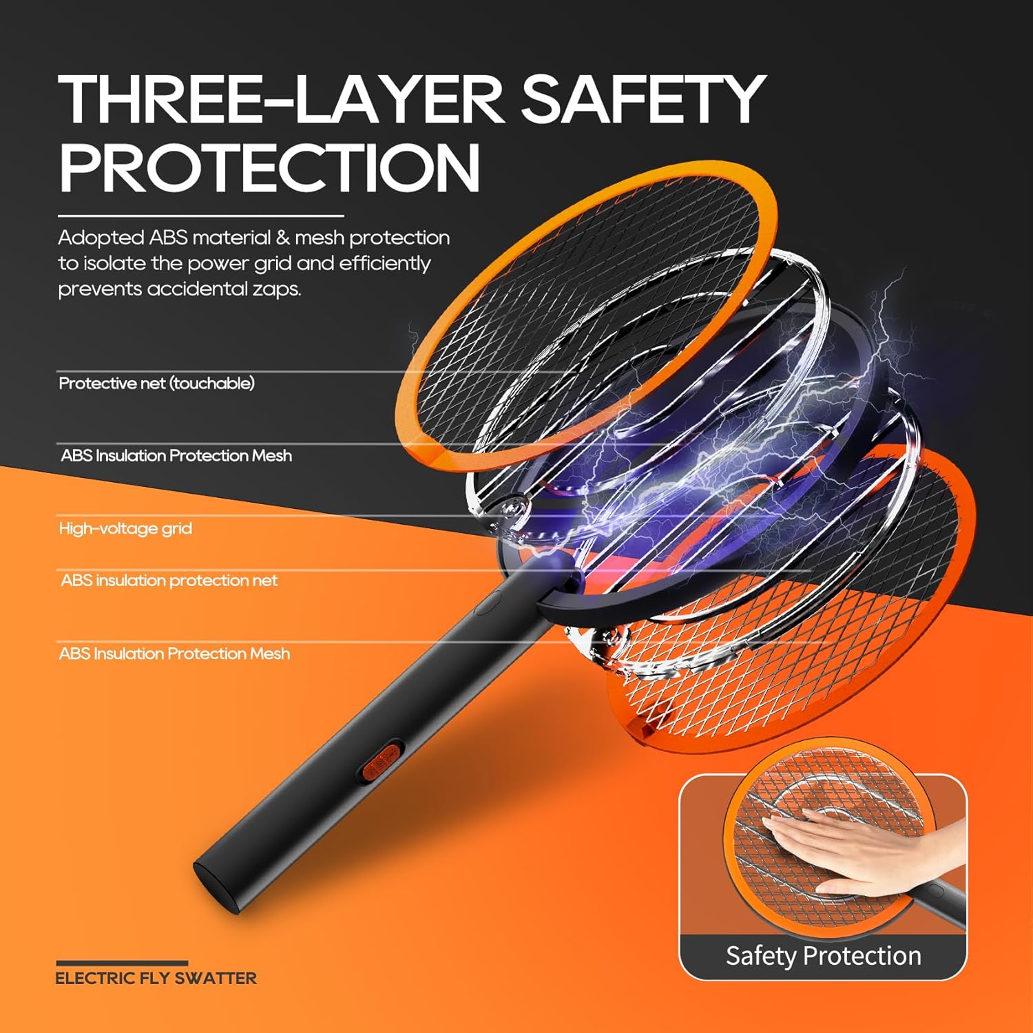 Double Switch & Easy to Use - In addition to the 3-Layer Safe net, we add the double switch to prevent children from accidentally operating. This mosquito killer racket is easy to use and suitable for the kitchen, bedroom, patio, outdoors, and camping. If you have any problems, please contact us immediately.