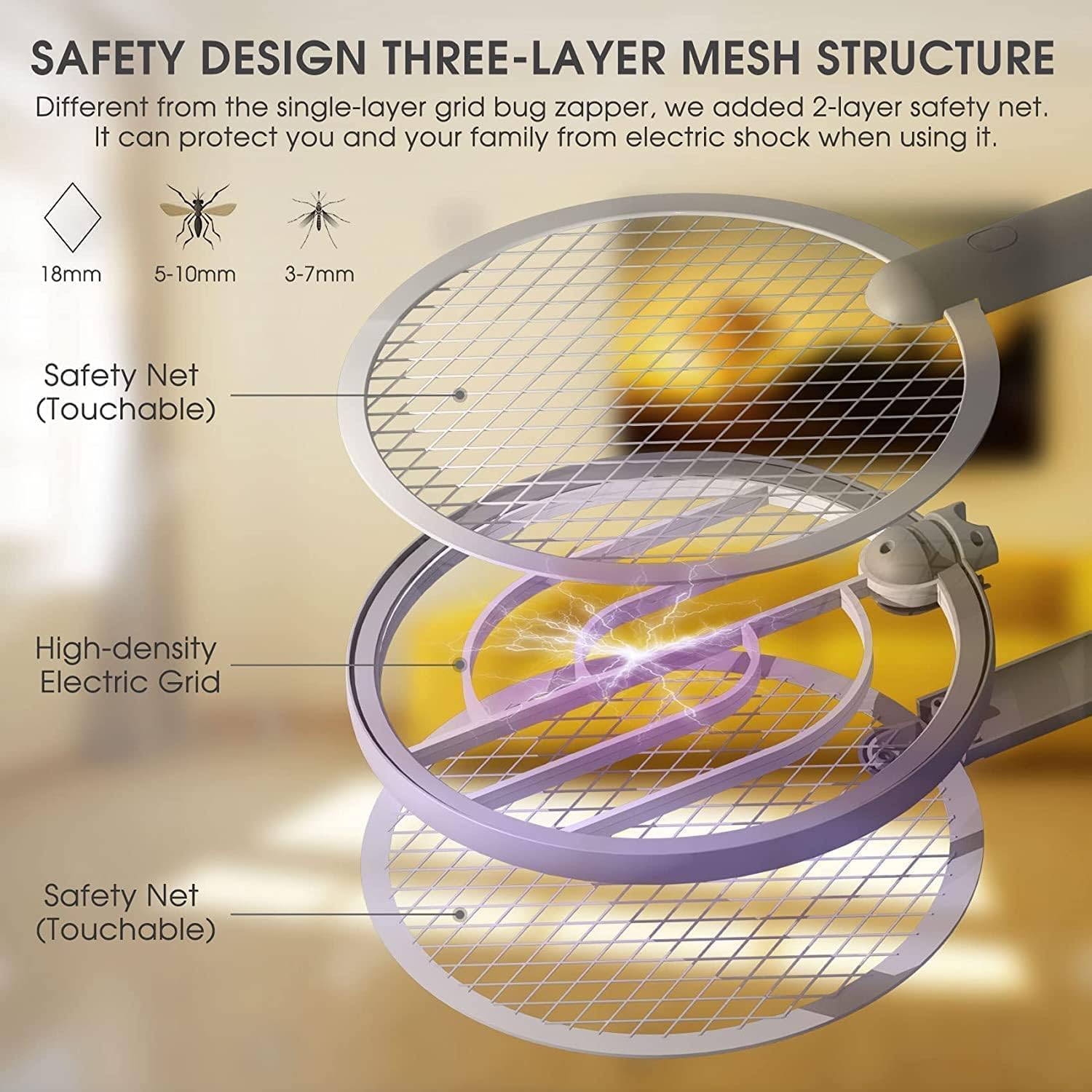 【Dual Switch & Easy To Use】- In addition to the 3-layer safety mesh, we also added a double switch to prevent accidental operation by children. This mosquito-killing swatter is easy to use, and suitable for placing in the kitchen, bedroom, and more. if you have any questions, please contact us immediately.