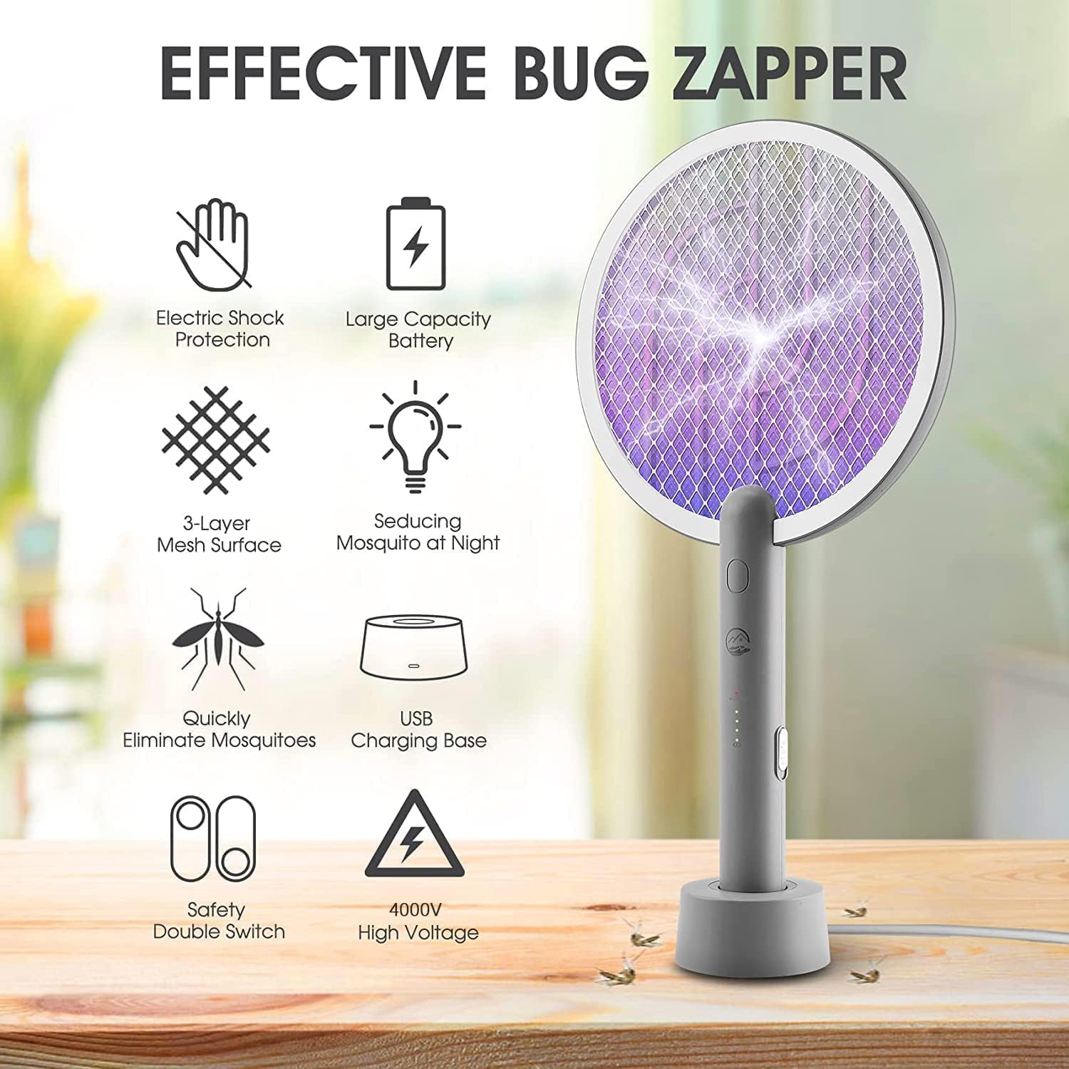 【2 in 1 Multifunction Bug Zapper】- Our Bug Zapper has upgraded 2 in 1 functions. You can turn on the "ON1" button to open the electric mosquito swatter mode to kill all flying types of bugs. In addition, you can also turn on the "ON2" button to open the mosquito lamp mode which will turn on the purple light to attract and shock mosquitoes.
